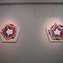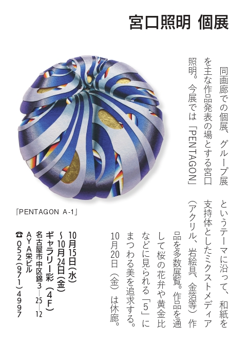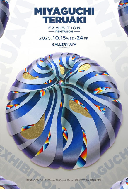 「今回の個展は、テーマを「PENTAGON」としました。7年ほど前から正5角形の1辺72度を作品の単位として表現を続けてきましたが、昨年からは、5点を組み合わせ72度×5=360度の集合体としての「PENTAGON」へと発展させました。「5」にまつわる形は、自然界の生き物たちにたくさん存在しています。例えば、魅了される美しい形の代表として花々を挙げてみると「5弁の花」が最も多く、その代表例として、桜や原種のバラ等が挙げられます。実は、美の秩序として代表的な比例である「黄金比」(1.61803…)が「5」の平方根(ルート)から導き出されることをご存じですか。「5」という数字が美を支配しているかのようで、私のお気に入りの数字となりました。さて、元々生物に興味がある私は、1987年の第1回展から36年間、一貫して「DNA」をメインテーマとして制作しています。原始の地球に生命が誕生し、30億年余の時が経ち、現在地球上には多種多様な生き物たちが溢れています。生命の連鎖を支える「DNA」というシステムは、進化を遂げながら営々と引き継がれてきました。今回の作品の制作技法は、和紙を支持体としたミクストメディア(アクリル、岩絵の具、金箔等)です。毎回表現方法に工夫を加え、多視点で捉え直し、制作に励んでおります。」(作家コメント)