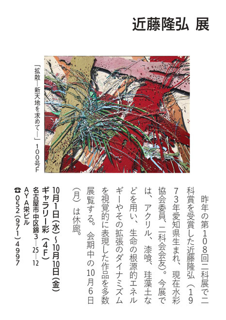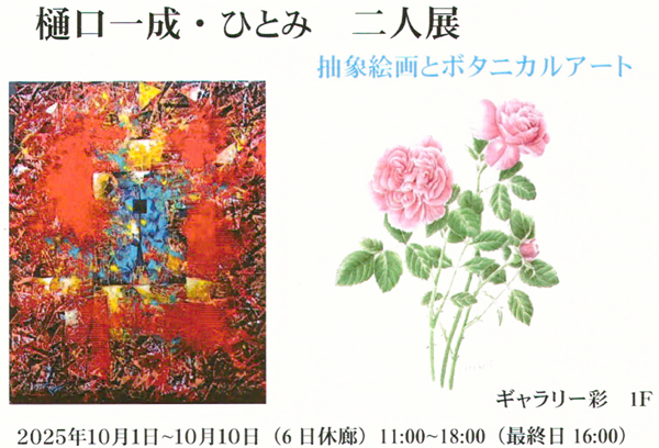 「時が経つほど、鮮明になっていく過去の記憶がある。幼少の頃に見た陶器を焼く窯の中の真っ赤な炎の記憶である。炎は全てを焼き尽くす「破壊の象徴」であり、一方、太古から人々にとっては「怖れ」であるが故、神聖なもの、「御神火」でもあり、また、炎によって文明が生まれ、文明を発展させる「創造の象徴」でもある。今、世界で起きていることの中で、記憶に留めておくべきこと、忘れてはならないことがある。私はその証言者の一人になりたい。今回は抽象絵画とボタニカルアートを展示した夫婦揃っての二人展となります。ぜひ多くの方に観ていただけると幸いです。」(作家コメント)