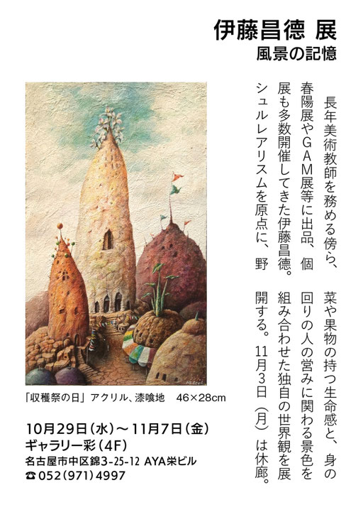 「私はキリコの形而上絵画やマグリットのシュールな絵画にリスペクトした作品が原点にある。題材は、野菜や果物など生命感のあるもの、風景の中や身の回りの物で人間の営みに関わるもので、デペイズマン・トロンプルイユなどを取り入れて、一つのシュールな世界をつくっている。テーマは「風景の記憶」。見るものが、自分の脳裏にある記憶(エピソード)を思い起こしながら、共感を持ってこの風景を見てもらえたらと願っている。」(作家コメント)